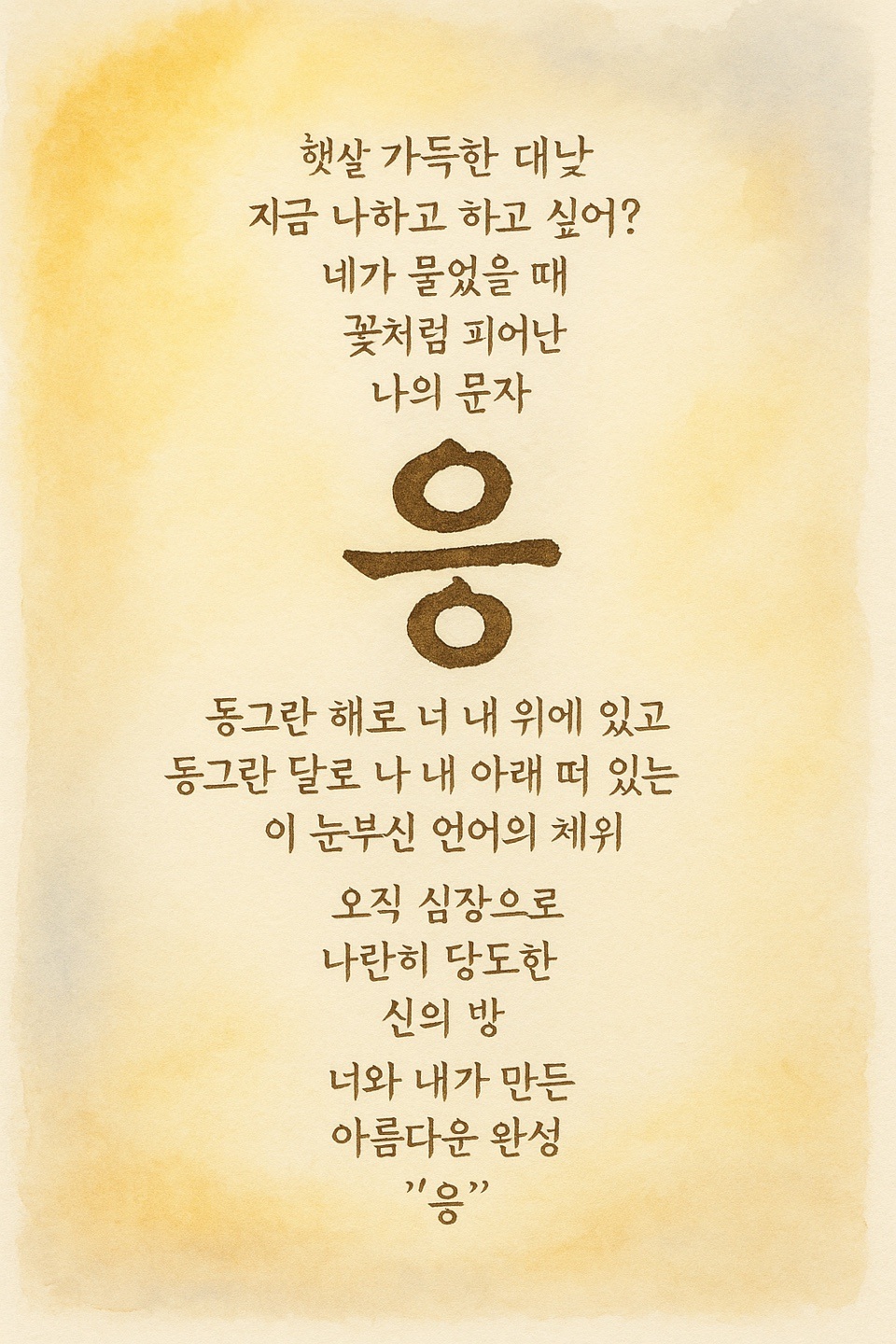 “응.”이라는 말 한마디만으로도 우리는 함께 걷고, 마주 앉아 밥을 먹고, 아무 말 없이도 서로를 이해할 수 있어요. ‘응’이라는 글자 안에 나란히 있는 두 개의 이응처럼, 우리도 그렇게 조용히 서로를 바라보고 있는지도 몰라요.