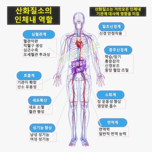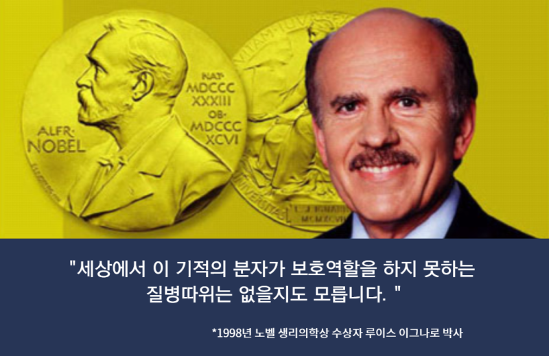 산화질소는 미국의 이그나루 박사님이 1998년도에 효능을 발견해서 노벨 생리 의학상을 받은 물질입니다. 산화질소는 혈관을 확장시켜 주는 물질이고 신경계 면역계에 작용하는 중요한 물질입니다.