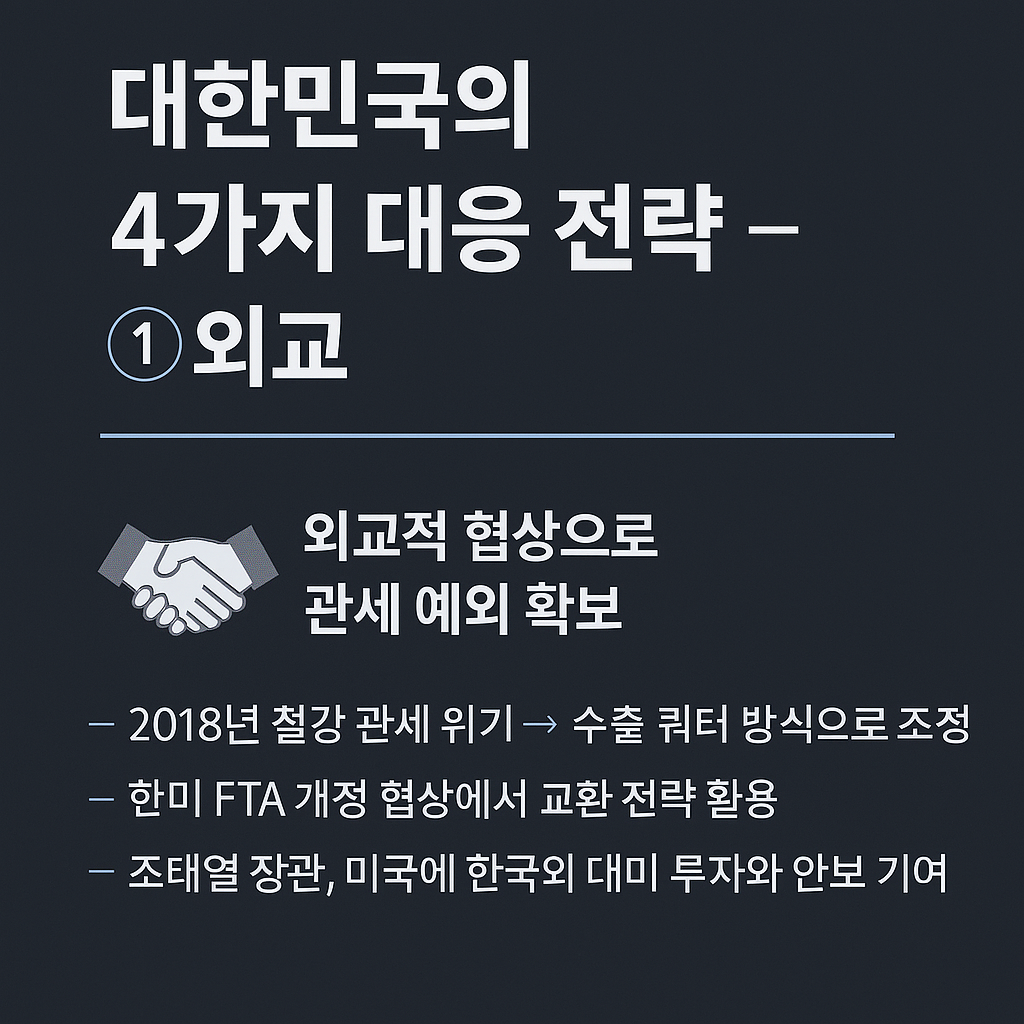 한국은 미국과의 안보 동맹, 경제 협력, 투자 실적 등을 강조하며 관세 예외를 외교적으로 이끌어내야 했다. 예를 들어, 2018년 한미 FTA(자유무역협정) 개정 협상에서 한국은 미국산 자동차 수입 기준 완화를 수용하는 대신, 철강 쿼터 협상을 유리하게 이끌어냈다. 이러한 **‘교환 외교 전략’**은 현실적인 대응 방법이다.