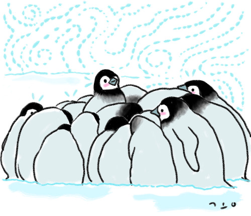 바깥쪽 펭귄의 체온이 떨어지면 안쪽 펭귄과 자리를 바꿔 전체가 체온을 유지해 나가요.