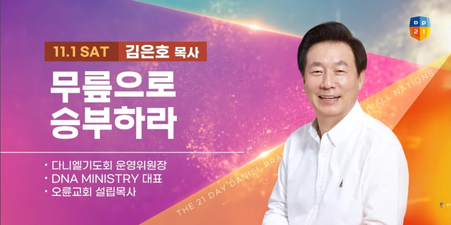 오륜교회 설립자이자 다니엘 기도회 운영위원장이신 김은호 목사님께서 21일 기도회를 인도하십니다. 성령으로 충만하고 영적으로 강건하시길 기도해 주세요. 대표 저서로는 다니엘 프로젝트, 하나님과 동행하는 삶, 당신이 기도했으면 좋겠습니다 등이 있습니다.