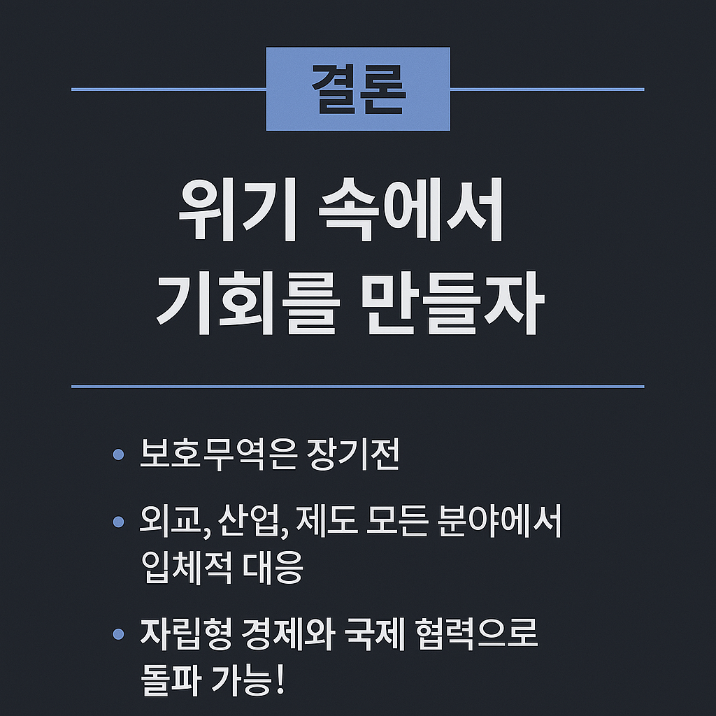 이러한 노력이 결합될 때, 대한민국은 보호무역의 위기를 기회로 전환하며 글로벌 경제의 불확실성 속에서도 굳건한 입지를 유지할 수 있을 것이다.