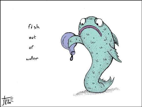 A fish out of water - 적응을 못해 불편함을 느끼는 사람 = 꿔다 놓은 보릿자루